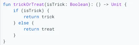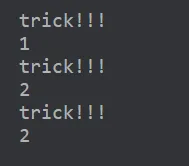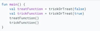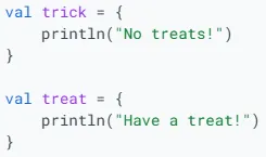 var trick= {println("trick!!!")}funmain() {// 正确函数引用:赋值不加()val funtrick = trick// 直接调用原函数trick()// 通过引用变量调用函数:加()funtrick()}