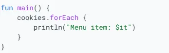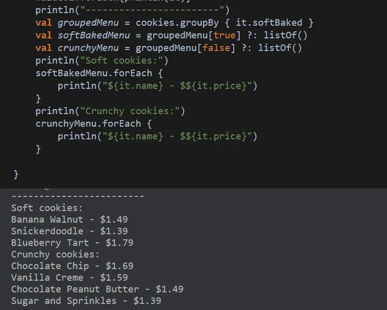 println("------------------------")val groupedMenu = cookies.groupBy { it.softBaked }val softBakedMenu = groupedMenu[true] ?: listOf()val crunchyMenu = groupedMenu[false] ?: listOf()println("Soft cookies:")softBakedMenu.forEach {println("${it.name} - $${it.price}")}println("Crunchy cookies:")crunchyMenu.forEach {println("${it.name} - $${it.price}")}