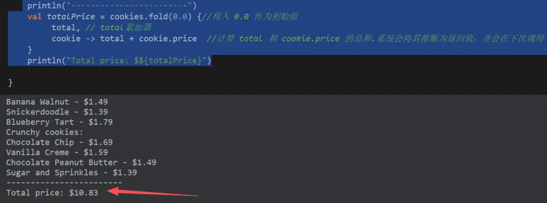 println("------------------------")val totalPrice = cookies.fold(0.0) {//传入 0.0 作为初始值total, // total累加器cookie -> total + cookie.price //计算 total 和 cookie.price 的总和.系统会将其推断为返回值,并会在下次调用 lambda 时为 total 传入此值。}println("Total price: $${totalPrice}")