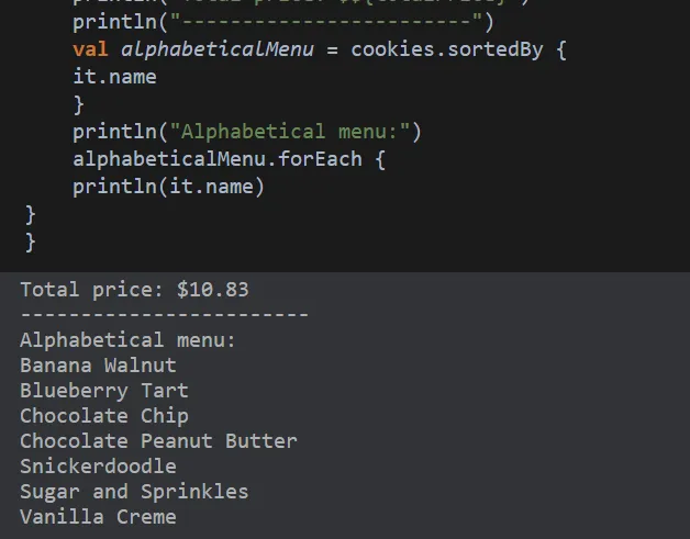 println("------------------------")val alphabeticalMenu = cookies.sortedBy {it.name}println("Alphabetical menu:")alphabeticalMenu.forEach {println(it.name)//饼干名称会按字母顺序输出。