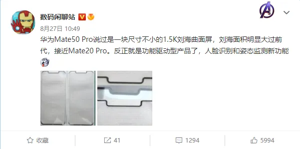 据博主@数码闲聊站最新晒出的前面板谍照显示,与此前曝光的消息基本一致,全新的华为Mate50系列将回归刘海屏设计,其中华为Mate50 Pro将会采用一块尺寸不小的1.5K刘海曲面屏,而且刘海面积明显大过前代,接近Mate20 Pro,对视觉效果和屏占比势必有一定的影响。