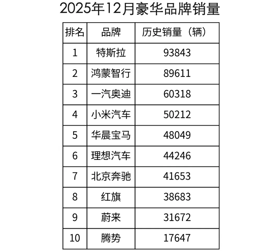 2025年12月豪华品牌销量榜一出,朋友圈直接炸了。特斯拉单月卖出93843辆,又一次坐上冠军宝座。鸿蒙智行以89611辆紧跟其后,只差不到4000台。乍一看还是“老美第一”,但局面已经不是几年前那个“特斯拉一家独大”的时代了。再往下看,小米和奥迪的差距只剩1万辆——这味儿,是真不一样了。