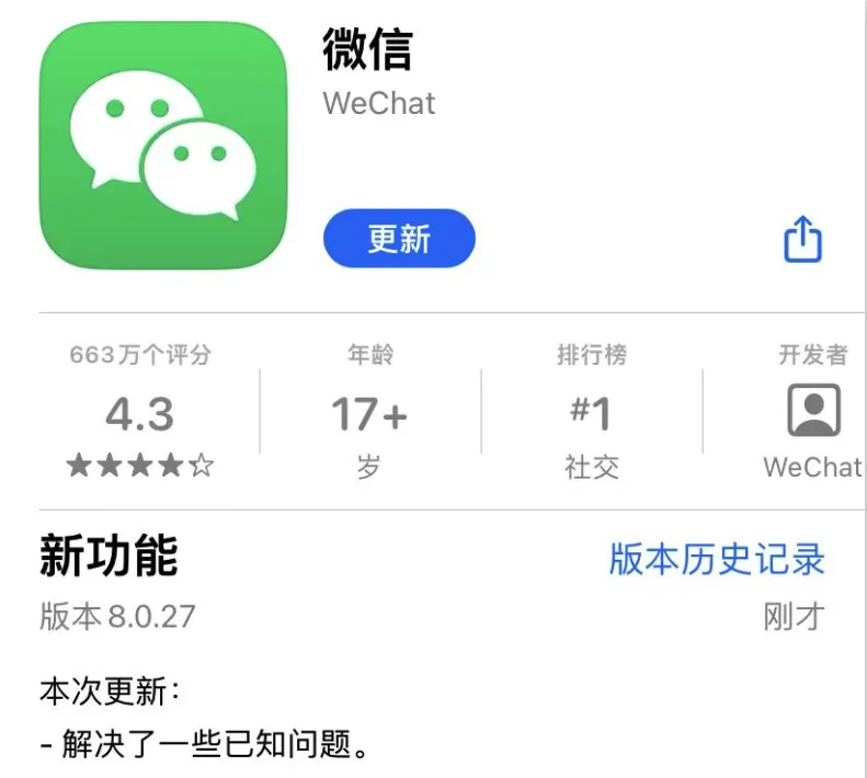 想要更新的小伙伴在苹果App Store直接搜索微信进入微信详情页面就能更新。