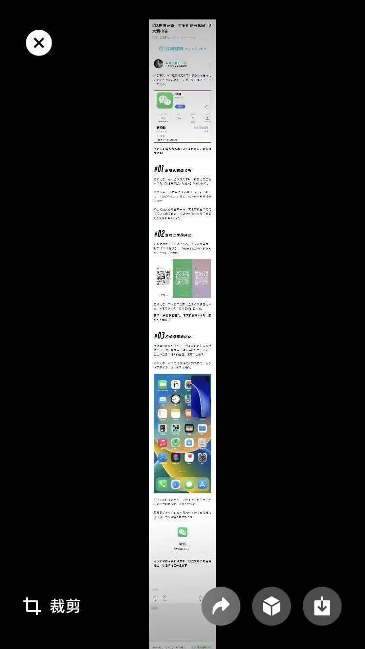 点击之后,微信会自动将整页显示为一张长图,可以进行裁剪、转发、保存到相册或收藏等操作。