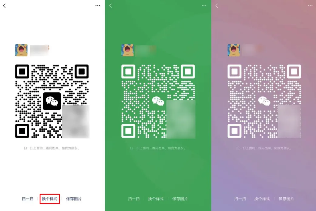 新版个人二维码界面,大家可以点击底部的【换个样式】,为自己的二维码更换风格,一共有9种样式。
