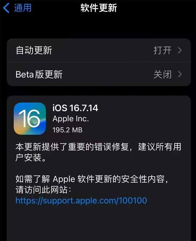 根据官方说明,iOS 16.7.14未公开具体安全漏洞细节,但强调“提供了重要的错误修复,建议所有用户安装”。
