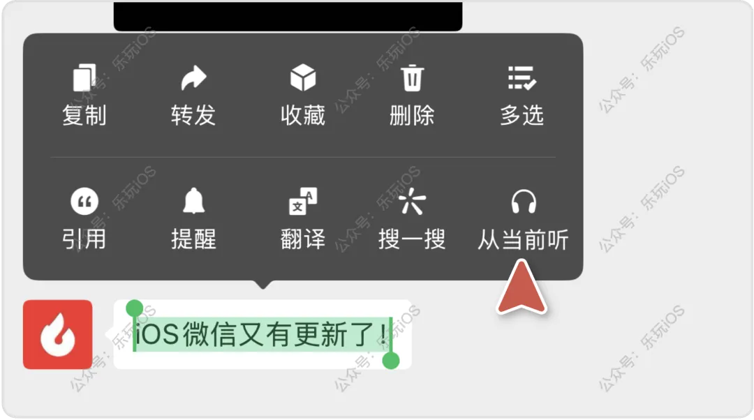 聊天对话框中,长按任意消息后,弹窗菜单里新增了「从当前听」功能,会自动识别并朗读出好友的昵称+消息内容