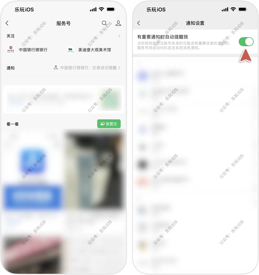 目前放量了,挺多人基本上都灰度到了,现在所有服务号均被折叠收纳进一个单独的入口,并且新增「有重要通知时自动提醒我」上方是关注的服务号,中间是通知,底部是看一看,点击右上角人像图标 > 通知设置,可开启重要通知自动提醒消息通知新增头像显示