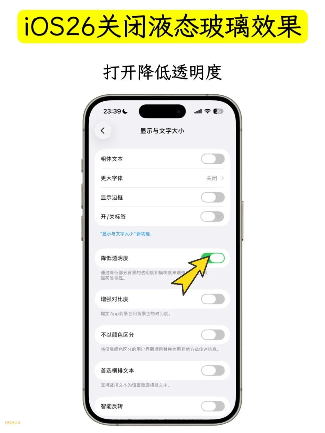 3. 打开「降低透明度」开关这一步可是关键!打开开关的瞬间,神奇的事情就发生了 文件夹的液态玻璃模糊感直接消失不见,取而代之的是干净又清爽的半透明磨砂质感,简直不要太舒服!