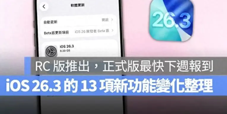 以上iOS 26.3 新功能与细节变化整理给大家参考;RC 版释出就代表iOS 26.3 测试已趋于完成,依照过往经验,若RC 版测试期间未出现重大问题,那最快在下周二(2/10)就会作为正式版推送给全球用户更新使用。