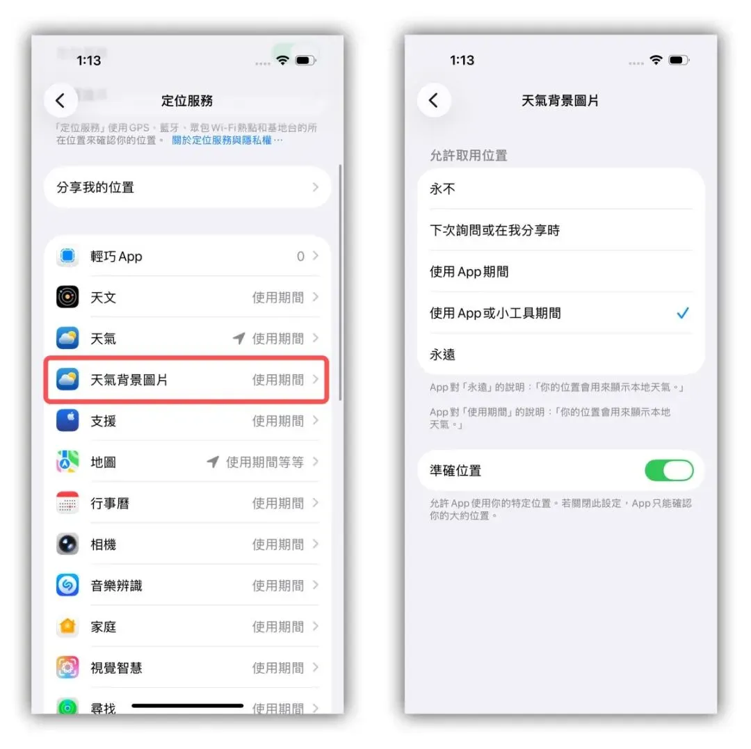 而且在「设定」→「隐私权与安全性」→「定位服务」,苹果还专门针对「天气背景图片」推出定位权限设定,进一步让用户掌握定位隐私权。