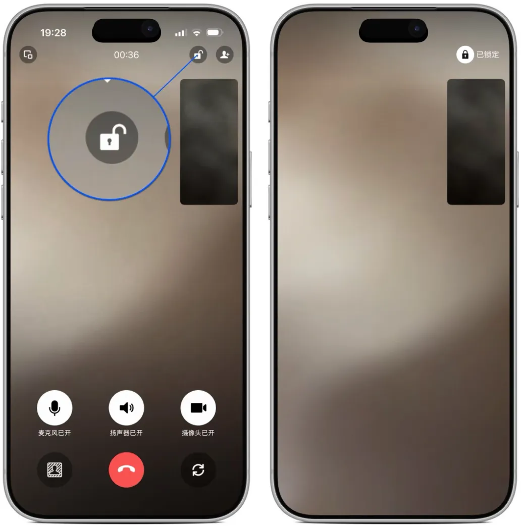 首先,更新后与好友视频通话时,现在界面右上角有一个“锁”的按钮,点击后可锁定当前画面状态,原本界面上的按钮将被隐藏,仅保留当前双方的视频画面。