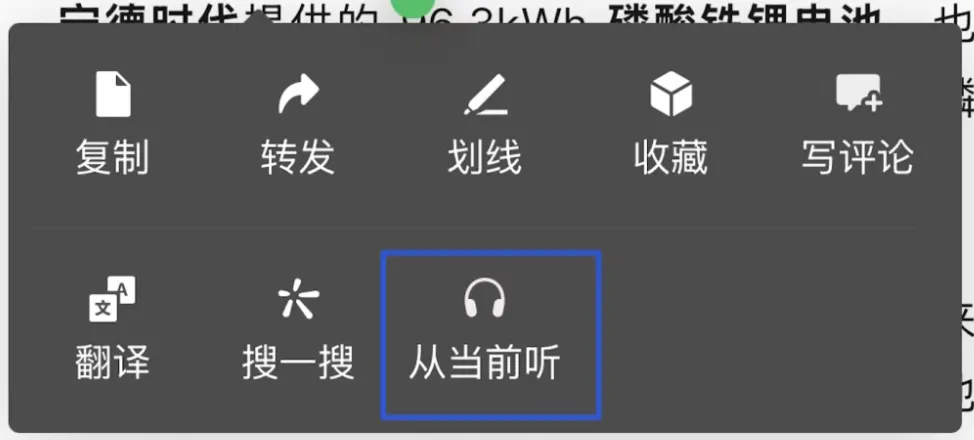 更新后在聊天界面长按某条信息,又或者长按选择文章的某段文字后,现在菜单栏中新增了“从当前听”的功能。