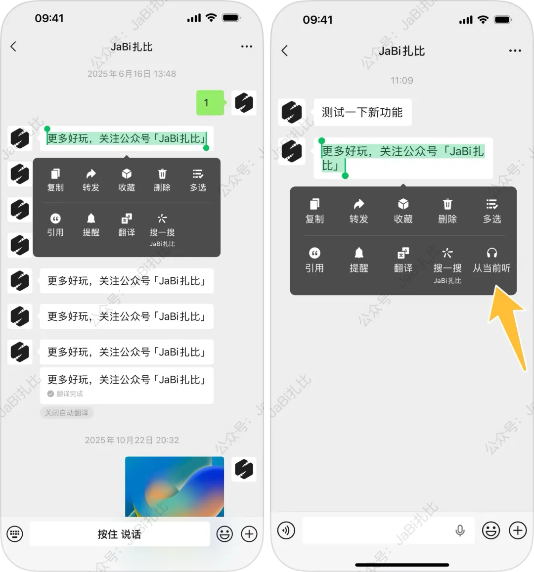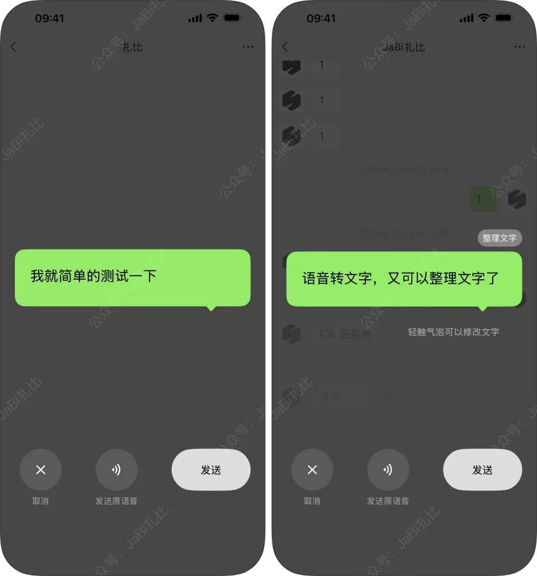 距离上一个正式版的更新,过去了大概一周的时间。昨日傍晚时分,iOS 微信发布了8.0.69正式版,这是年前最后一更了。按照惯例,我们还是要先看看官方的更新说明。毫无意外,和往常一样依旧只显示一句「解决了一些已知问题」,如图:在 iOS 微信8.0.69测试版时,扎比就发现了测试版的语音转文字界面去掉了「整理文字」功能。更新到正式版后,绿色大气泡的上方的「整理文字」和下方可以编辑提示都回来了,如图:(左图:8.0.69测试版;右图:8.0.69正式版)另外,测试版时公众号主页的首条文章改成大图显示。更新至正式版后,又改回了1:1的小正方形样式了。如图:(左图:8.0.69测试版;右图:8.0.69正式版)这样看来,测试版时的两个变化都只是 BUG 而已。不过,扎比看到有的人写8.0.69正式版文章时还把这两个变化写进去,我甚至怀疑他们是不是测试版时就把文章写好,正式版一发布就抢着发文,并没有真正去看正式版有哪些变化。当我们长按聊天界面中的聊天消息后,在弹出菜单中可以看到,这里新增了一个「从当前听」的功能。点击后,微信会从当前位置一直以声音播报的形式朗读聊天内容。而且会不断往下读,直到读完或者手动点击停止为止。这个功能扎比是从8.0.68版本开始发现的,不是8.0.69独占。并且目前处于灰度测试阶段,只有部分用户能体验。「从当前听」可以让用户一边忙事情一边听聊天内容,非常方便。在微信视频通话时,界面的右上角新增了一个小锁头图标。点击该图标即可锁定界面,仅保留双方视频画面和「已锁定」的提示。有了这个锁定功能,在视频通话时就可以避免小孩子或老人家不小心碰到红色的挂断按钮,导致视频通话突然中断的尴尬局面。目前锁定功能,仅支持视频聊天。在8.0.68至8.0.69正式版期间,微信新增了一些灰度测试变化。首先是公众号入口的图标发生了变化,改成了像一朵花又像一本展开的书的图案。【点击回顾】其次,就是支持开启服务号的重要通知提醒了。在服务号的通知设置顶部,新增了「有重要通知时自动提醒我」的开关。【点击回顾】从8.0.58版本开始,微信图标就去掉了深色图标样式。到了如今的8.0.69正式版,在深色状态下的微信图标依旧是“绿的发慌”,还没有改回来。想要更新的小伙伴们,可直接在 App Store 中更新。如果没看到有可用更新,刷新一下应用更新列表即可。