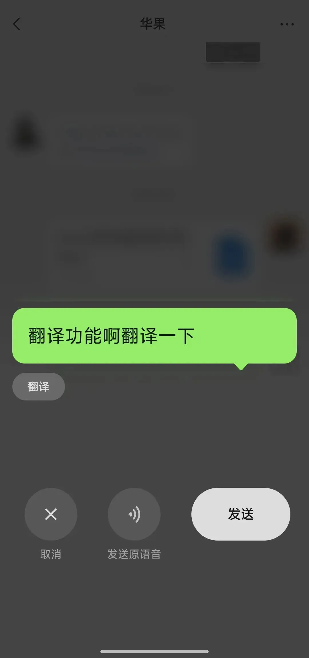 通过「按住 说话」录入语音,再右滑到「滑到这里 转文字」,放手后,文字框下会显示「翻译」按钮,可直接翻译当前文字。点击翻译按钮,还会出现「切换语言」、「朗读」操作选项,点击「切换语言」会快捷切换翻译后的语言,点击「朗读」,会语音读出聊天气泡中的内容。