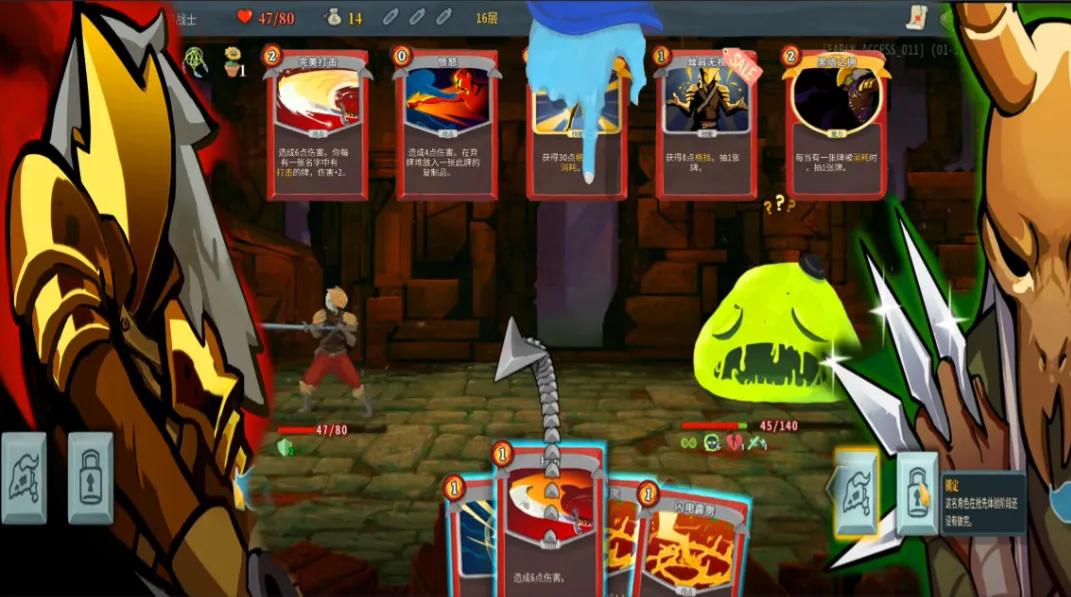 《杀戮尖塔》的核心规则简单到可以用三句话概括:每回合抽五张牌,需要能量打出卡牌,击败敌人前进。但在这些简单规则之下,是一个深不见底的可能性宇宙。游戏有350多张可收集卡牌,200多种遗物(提供被动能力),以及无数随机事件。但真正让它与众不同的是构筑系统——每次战斗胜利后,你可以从三张随机卡牌中选择一张加入牌组。这个看似简单的选择,却成为游戏最精髓的部分。短期的生存需求与长期的构筑愿景,风险与回报,专业化与泛用性——每一个选择都是对你战略眼光的考验。