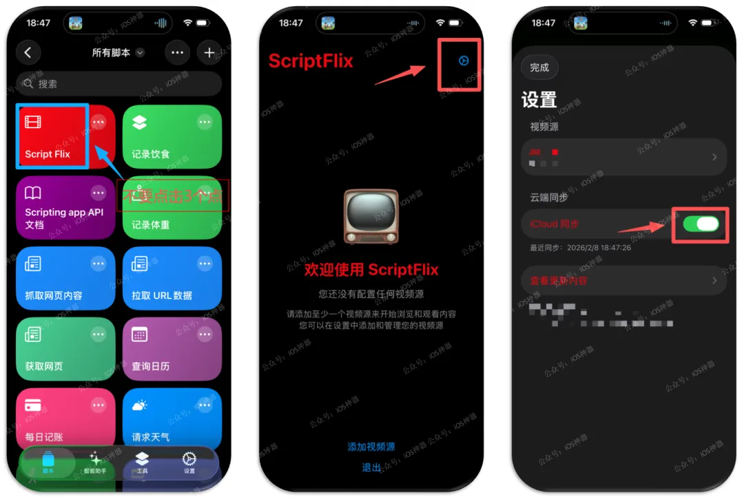 添加完毕后,点击【Script Flix】(不要点那三个点),然后点击右上角【设置】,打开【iCloud同步】,最后,点左上角【完成】即可食用!
