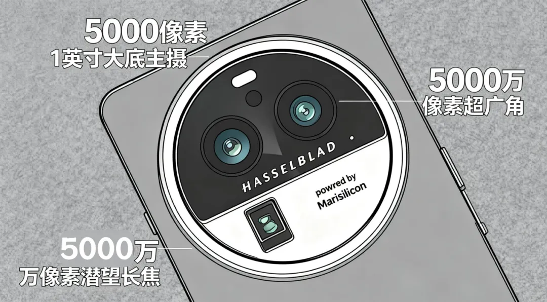 5000 万像素 1 英寸大底主摄、5000 万像素超广角、5000 万像素潜望长焦。