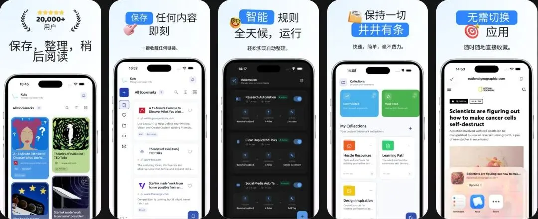 支持从 Safari、Chrome 等应用一键剪藏网页,用嵌套文件夹与多标签灵活整理,配合“智能规则”(触发器→条件→操作)在保存时自动标记、移动或清理链接。