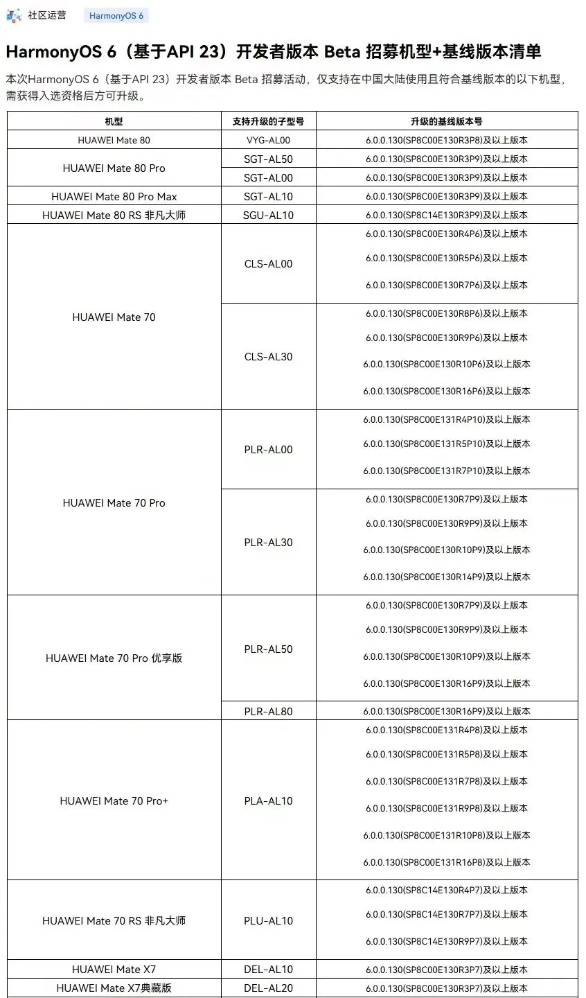 这里重点说下大家关心的推送细节和注意事项。这次开发者版本,目前仅支持Mate 70系列及以后的旗舰机型,nova系列暂时没有适配,后续会逐步扩展;推送对象主要是完成实名认证的开发者,招募名额5万个,需要在华为开发者联盟App报名,签署保密协议后,才能收到OTA推送。