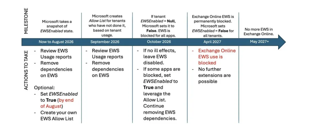 根据微软计划,Exchange Online 的 EWS 将从 2026 年 10 月 1 日起默认被阻止,但管理员可通过应用程序白名单临时维持访问权限。最终停用时间为 2027 年 4 月 1 日。