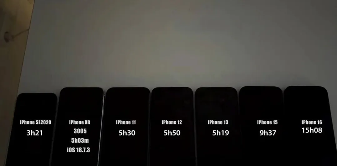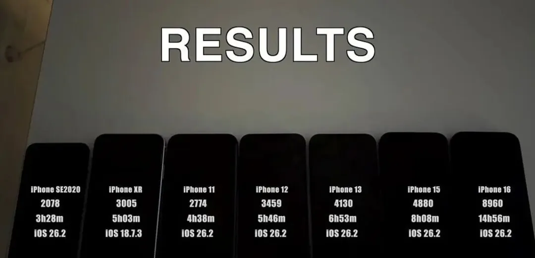 最后再补充一下,测试数据来自YouTube频道iAppleBytes的公开视频,他们采用同一批设备,系统版本分别为iOS 26.2和26.2.1,条件保持一样,数据能够当作参考。可是每个人的使用习惯和电池健康程度不一样,实际体验肯定存在差别。