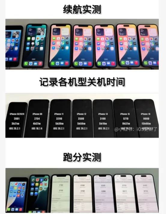 科代表不要忘记提醒一下,这个测试当下是处于满负荷跑分的状态,和你平常刷微信、看视频的实际续航可不完全一样。不过趋势还是比较清晰的,iOS 26.2.1对不同机型的优化确实有比较明显的差别。