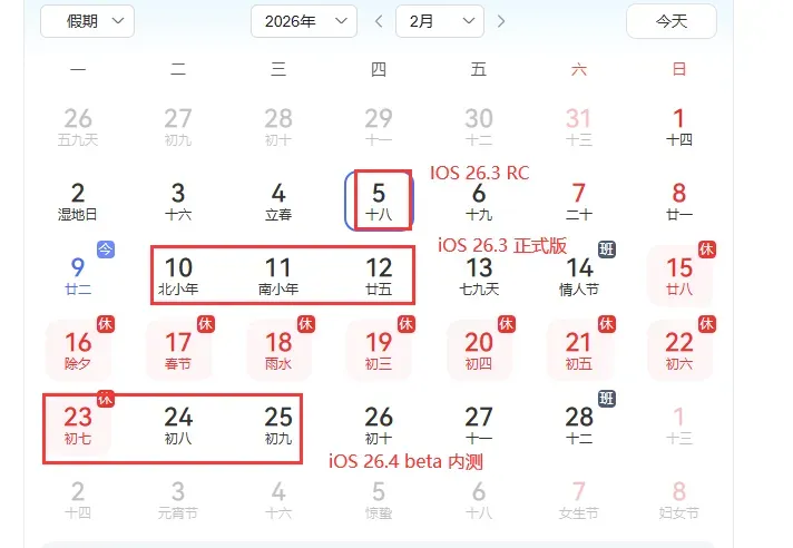 先来分析一下iOS系统发布安排,本周可能会发布 iOS 26.3 正式版系统,毕竟上周发布 iOS 26.3 RC 候选版,也就是准正式版系统,接着就是安排推出 iOS 26.4 beta 1 内测,根据以往内测发布,本月底可能性很大。