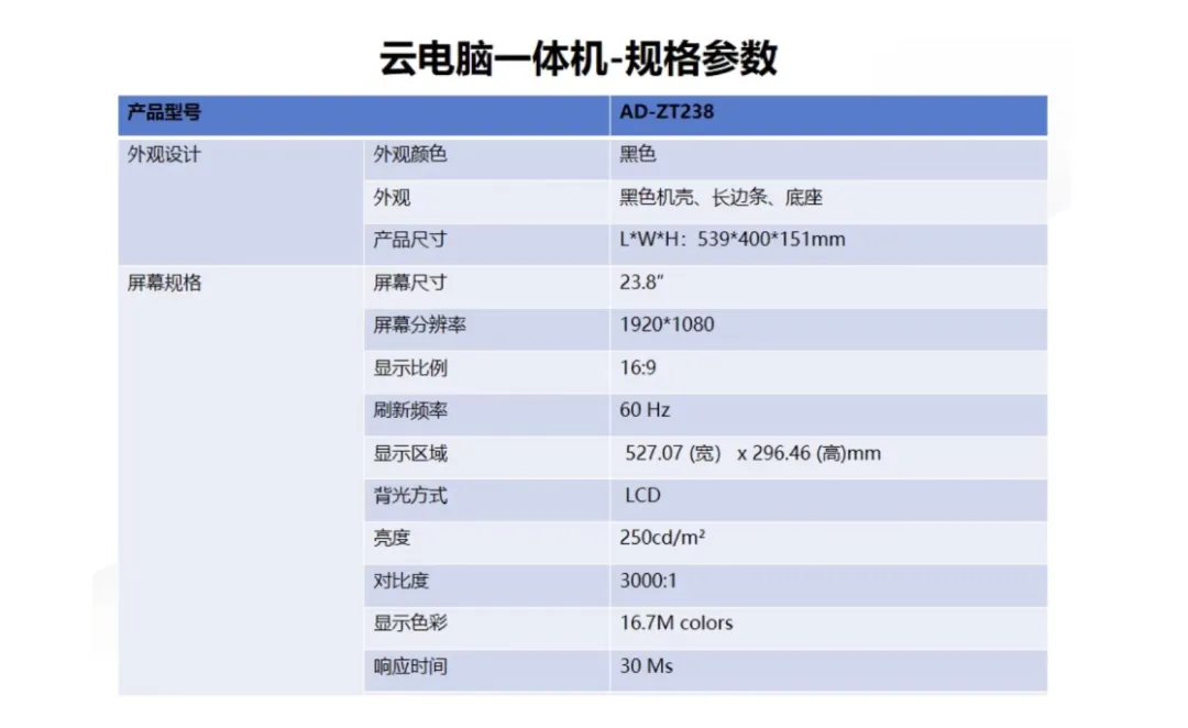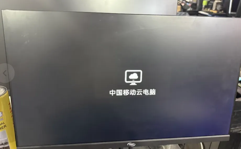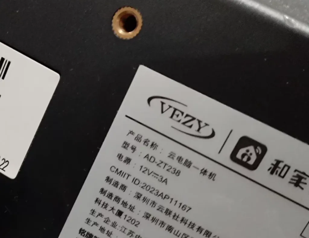 从型号AD-ZT238的铭牌能看出,这是云联社(VEZY)给中国移动代工的"云电脑"终端。所谓云电脑,本质是块带安卓系统的显示屏,运算全靠远程服务器。