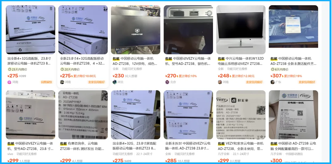 数码圈有个不成文的规矩:看到运营商定制设备大量出现在闲鱼,第一反应是"这玩意儿能刷机吗"。最近看到闲鱼大量流出的中国移动云电脑一体机ZT238,23.8寸大屏、4G+32G配置、送无线键鼠,二手230+。