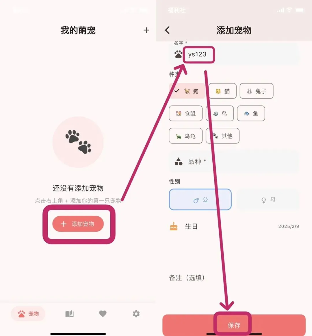 首页点击-添加宠物-在名字处输入:ys123 - 点击保存,即可