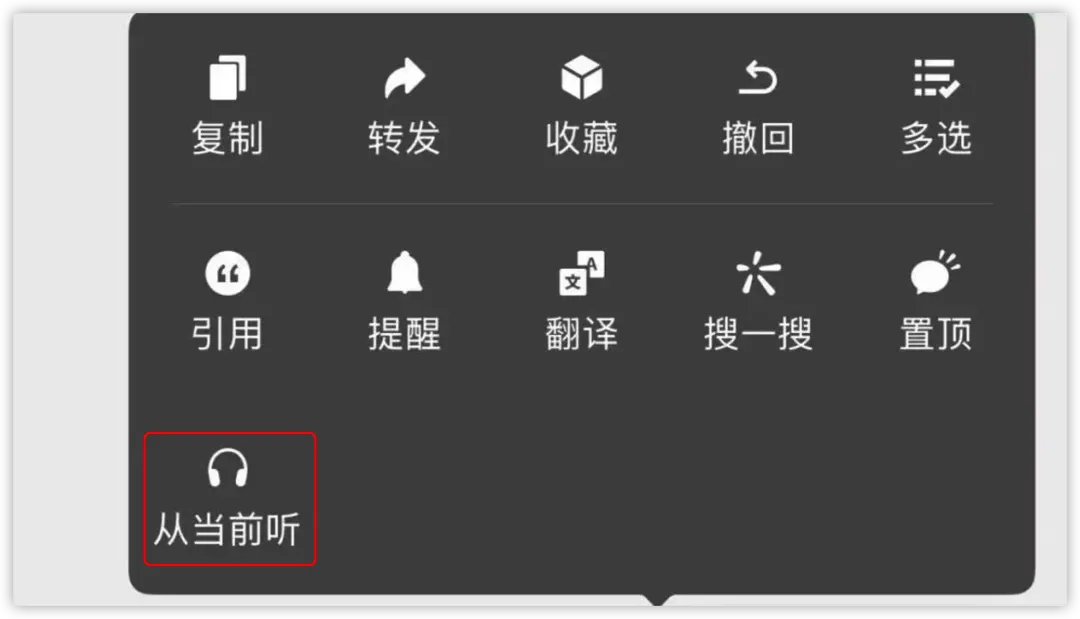 长按聊天内容时,可以看到新增的「从当前听」功能选项。朗读过程将一直持续,直到整个聊天界面上的内容都被读过一遍。语音转文字
