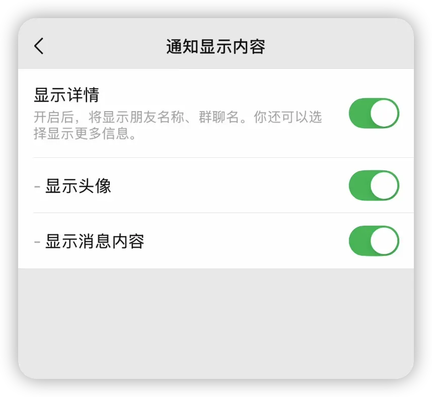 进入微信「设置」—「通知」,在「通知显示内容」可以看到全新的界面设计。