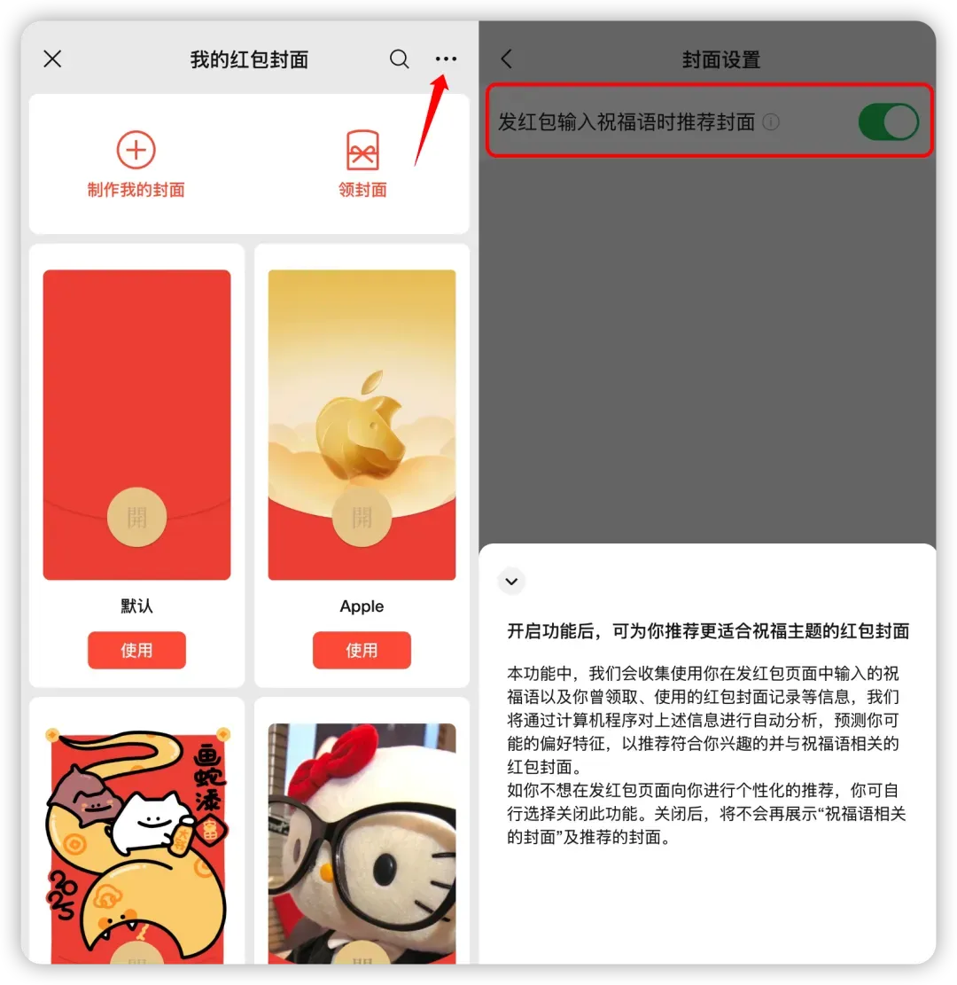 进入红包封面管理,点击右上角的「…」,就能看到一个名为「发红包输入祝福语时推荐封面」的功能开关。