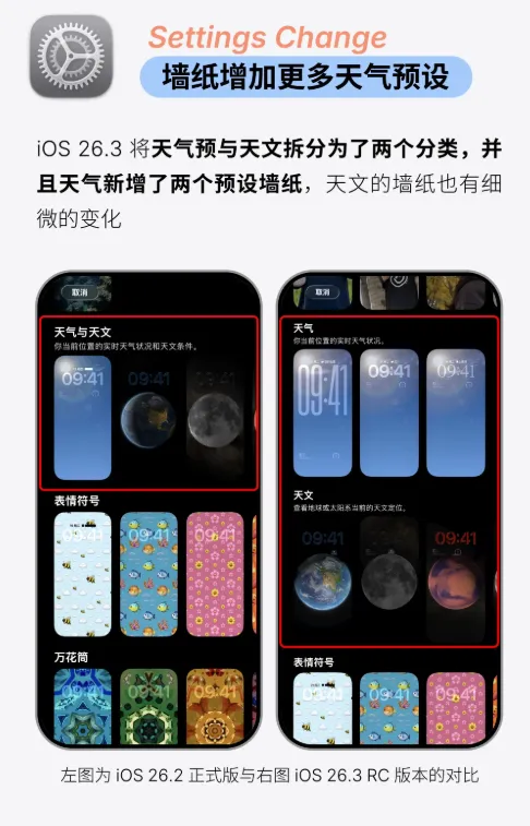 26.3 里不止是修 Bug,“天气与天文”壁纸做了重组,欧盟区域的“通知转发”更细了些,细节补起来,机型之间的落地却不太一样,有 iPhone 11 和 12 的用户说更新后顺滑度不如 26.2.1,和预期比有偏差,这类反馈挂在测试阶段的评论里能看到。