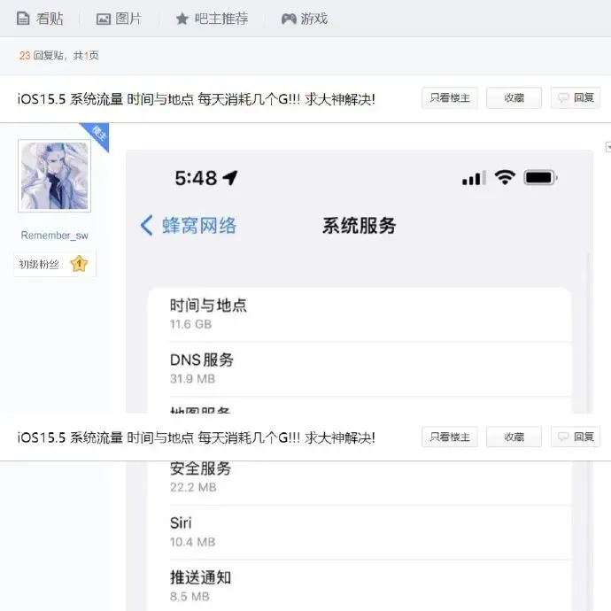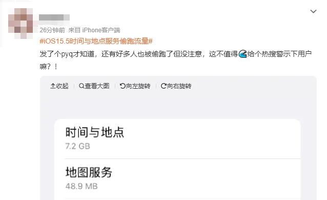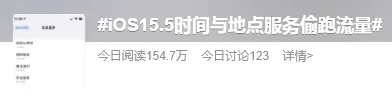 有网友发现,iOS 15.5 正式版系统的“时间与地点”偷跑了大量手机流量,每天消耗几个G。