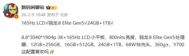 其能力强的地方还不只是CPU芯片,3K分辨率+165Hz的组合其实不算是太新颖的组合,去年就已经有平板产品用上,但如果搭配上LCD材质,就真的不多见,8.8寸屏幕也不算小,800nit屏幕亮度也还算可以,显示效果应该有保证,按正常迭代来算,这应该是Y700第五代产品。