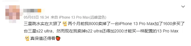 发售两个月后,三星 Galaxy S22 系列贬值率为 46.8%,iPhone 13 系列仅贬值 16.4%。