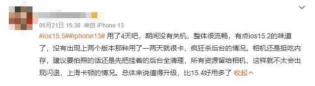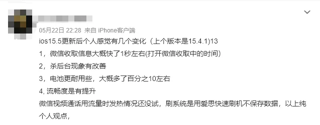不少网友反馈,升级了 iOS 15.5 之后:口罩解锁速度更快了、手机更流畅、杀后台现象改善、续航更好。