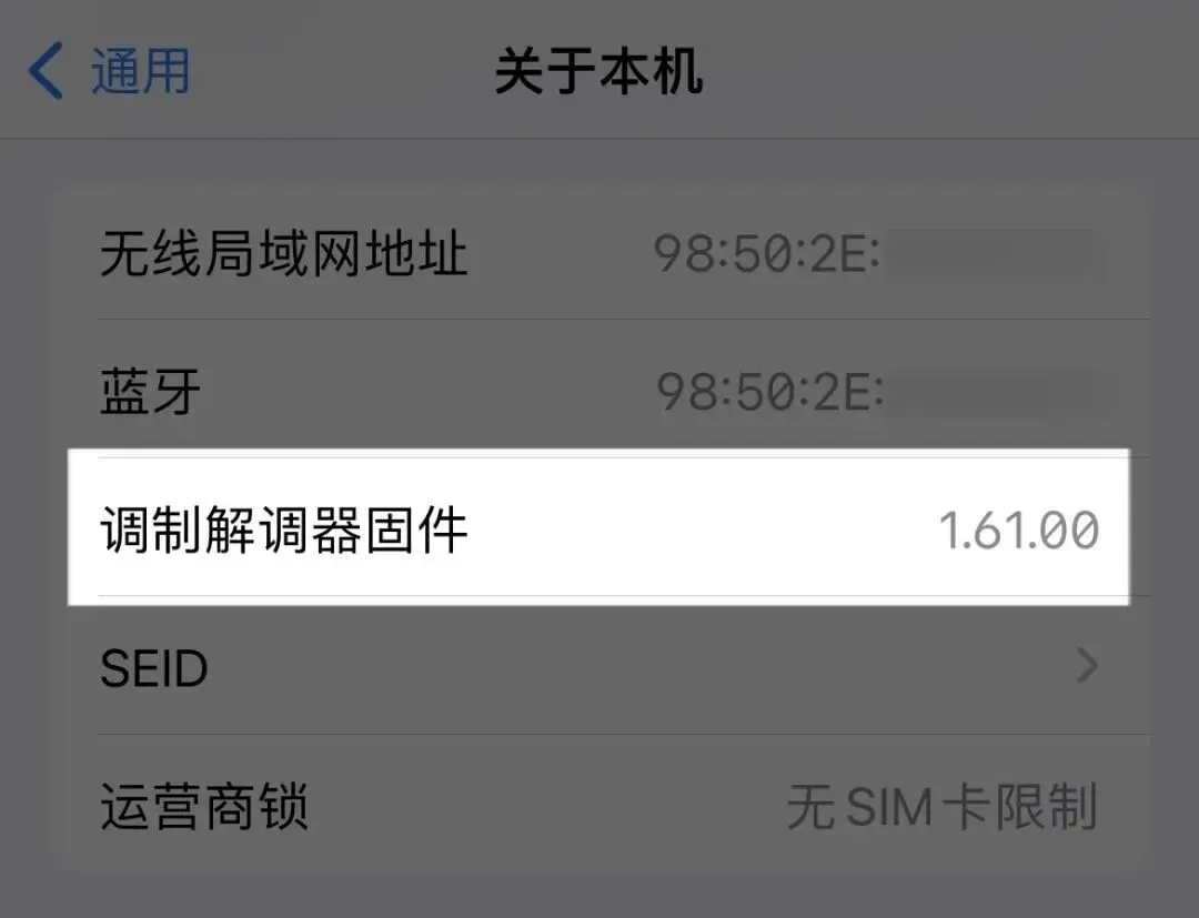 更新之后,点击「设置」—「通用」—「关于本机」查看「调制解调器」的固件版本。