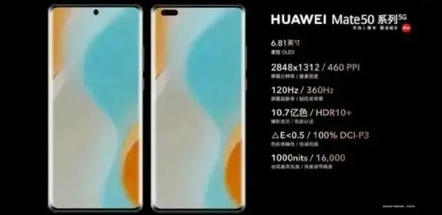 屏幕上,与此前曝光一致,全新的华为Mate50系列不仅会首次采用88°超大曲率屏幕,还将大幅提升屏幕显示效果;回归小刘海屏设计后,尺寸为6.81英寸,分辨率未2848×1312,像素密度460PPI,支持120Hz高刷,并能实现1-120Hz的自适应刷新率调节功能。同时还支持10bit显示以及HDR10+认证,全局最高亮度为1000nits,支持16000亮度调节。