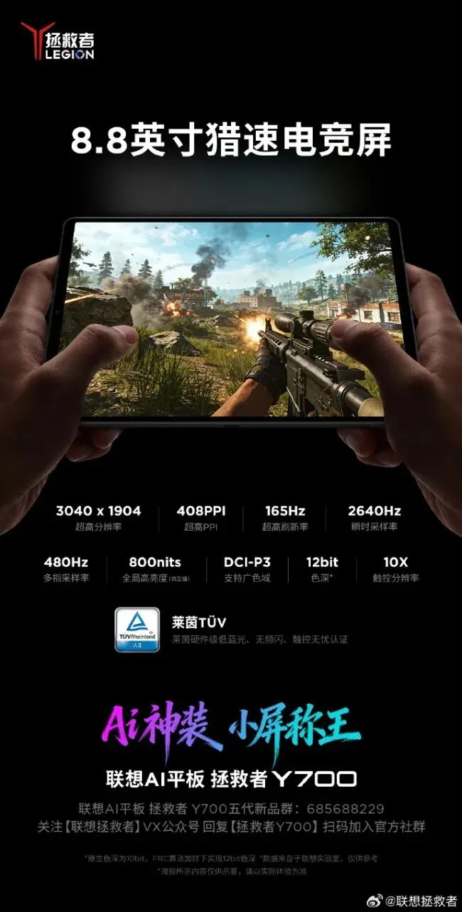 屏幕方面,新款Y700依然坚守 LCD阵营,搭载了一块分辨率高达3040*1904的3K+“猎速电竞屏”。这块屏幕支持 165Hz超高刷新率 以及2640Hz瞬时采样率,全局典型亮度提升至 800nits,彻底解决了前代产品在强光下观感稍弱的短板。对于长期深受OLED频闪困扰的游戏玩家而言,这几乎是目前市面上性能最强、素质最高的护眼游戏屏选项。