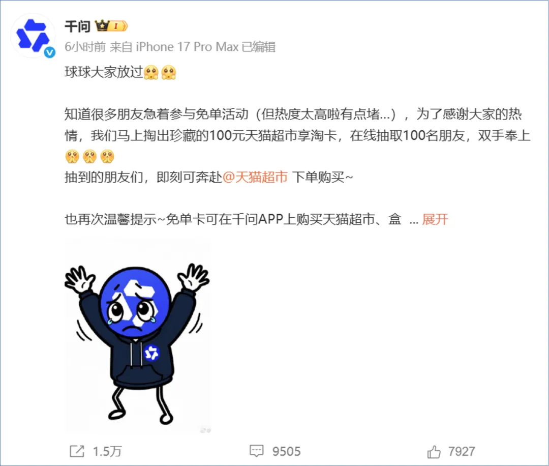 对此,千问官微发文回应称,“球球大家放过,知道很多朋友急着参与免单活动,但热度太高有点堵… 免单卡有效期至 2 月 28 日,大家慢慢来,保证一定能用掉。”