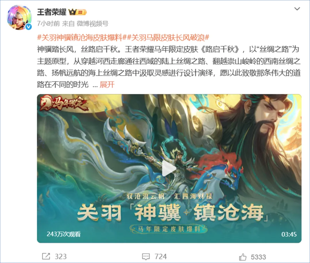 《王者荣耀》宣布关羽马年限定皮肤“神骥·镇沧海”将于 2026 年 2 月 15 日至 4 月 19 日限时上架商城,首周价 1430 点券,后续 1788 点券。