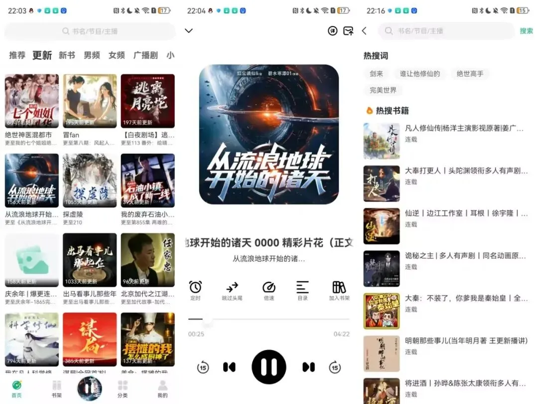 - 资源丰富多样:内置多种类型的有声书资源,从经典文学到热门网文,应有尽有。