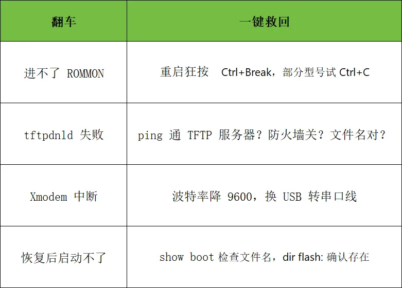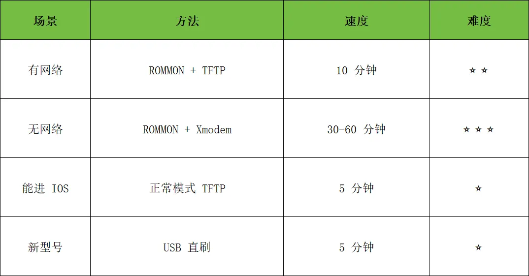 思科交换机 IOS 恢复 4 法:TFTP 最快 10 分钟,Xmodem 串口救急 30-60 分钟,USB 直刷 5 分钟,正常模式升级零中断;附 ROMMON 命令与翻车急救,型号匹配第一条,30 分钟满血复活。Ctrl+Break 进 ROMMON,TFTP 10 分钟、Xmodem 30 分钟、USB 秒传——总有一款能救场。