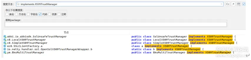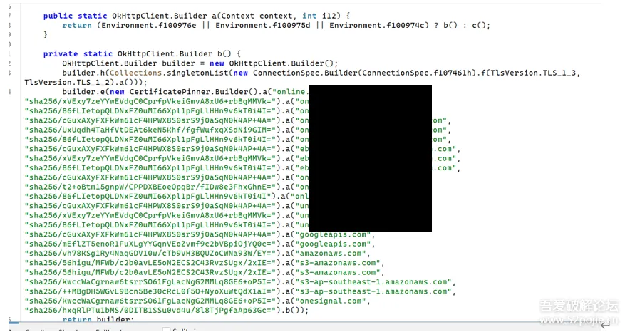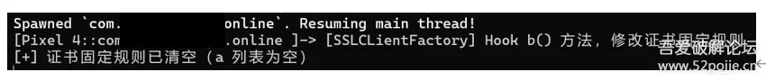 function main() { Java.perform(function () { const SSLCLientFactory = Java.use("ec0.a"); const CertificatePinnerBuilder = Java.use("okhttp3.CertificatePinner$Builder"); const JavaCollection = Java.use("java.util.Collection"); SSLCLientFactory.b.implementation = function () { console.log("[SSLCLientFactory] Hook b() 方法,修改证书固定规则"); // 获取原始 Builder let originalBuilder = this.b(); // 获取原 CertificatePinner.Builder const field = originalBuilder.getClass().getDeclaredField("v"); field.setAccessible(true); let certPinnerBuilder = field.get(originalBuilder); // 3. 获取 Builder 内部存储规则的列表 a const pinListField = certPinnerBuilder.getClass().getDeclaredField("a"); pinListField.setAccessible(true); let pinList = pinListField.get(certPinnerBuilder); // 4. 清空列表 const javaList = Java.cast(pinList, JavaCollection); javaList.clear(); console.log("[+] 证书固定规则已清空(a 列表为空)"); return originalBuilder; };});}setImmediate(main);