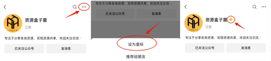由于推送机制的原因,公众号会优先推送你设为星标的账号,为了及时收到文章推送,大家可按照下面的图片“加星标”,每日资源分享早知道。