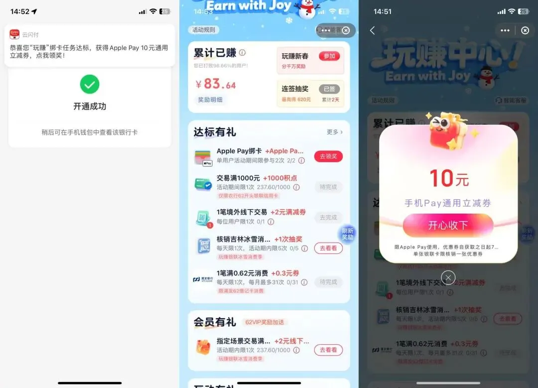 通过云闪付绑一张从没有绑过的卡到Apple钱包,会送10元通用券一张,需要领取,两张就是20