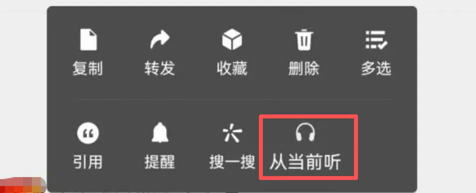 首先,文章、聊天内容支持收听功能,就是我们长按聊天信息或文章内容后,现在功能栏中多了一个「从当前听」的选项,点击后系统会从当前信息连续朗读下面的内容,直到信息朗读完为止。